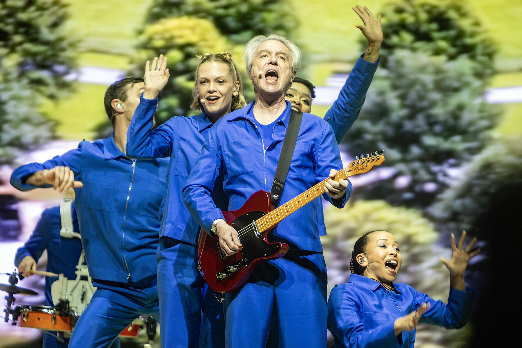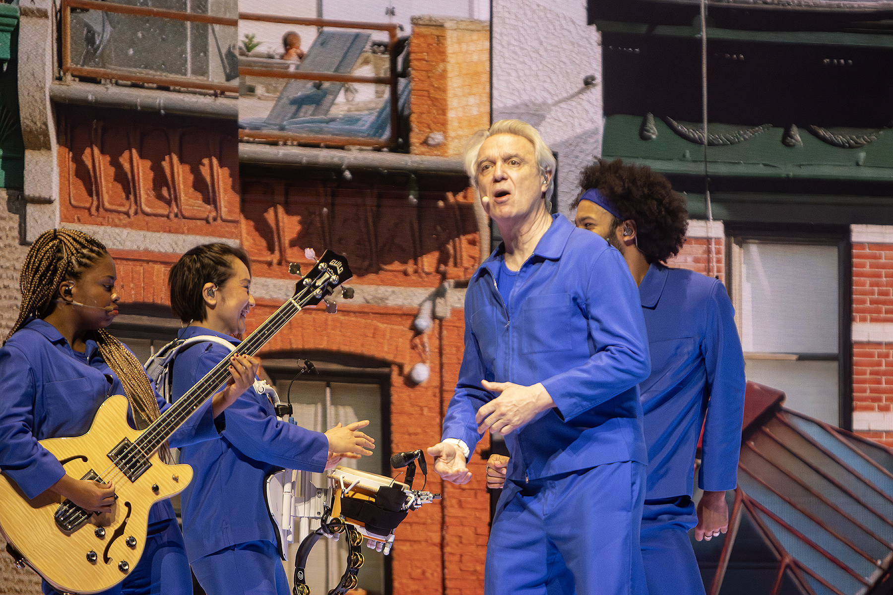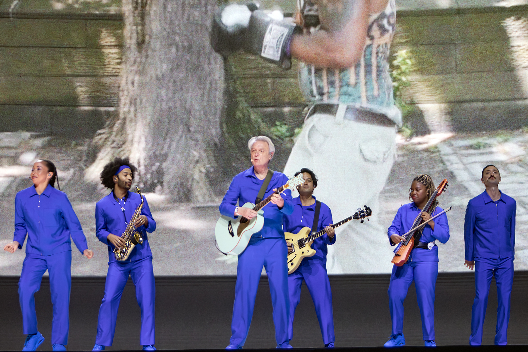 Backed by an ensemble of mobile, wireless musicians, Byrne constructed the show like a living art piece. Instead of a traditional stage setup with fixed instruments, every performer moved freely, creating shifting patterns of rhythm and choreography that felt both organic and meticulously orchestrated. Drummers marched in geometric lines, guitarists circled Byrne like orbiting satellites, and vocalists drifted across the stage as if pulled by invisible tides. Combined with the collage of photos and visuals behind him, the effect was mesmerizing, turning each song into a kinetic sculpture of sorts.