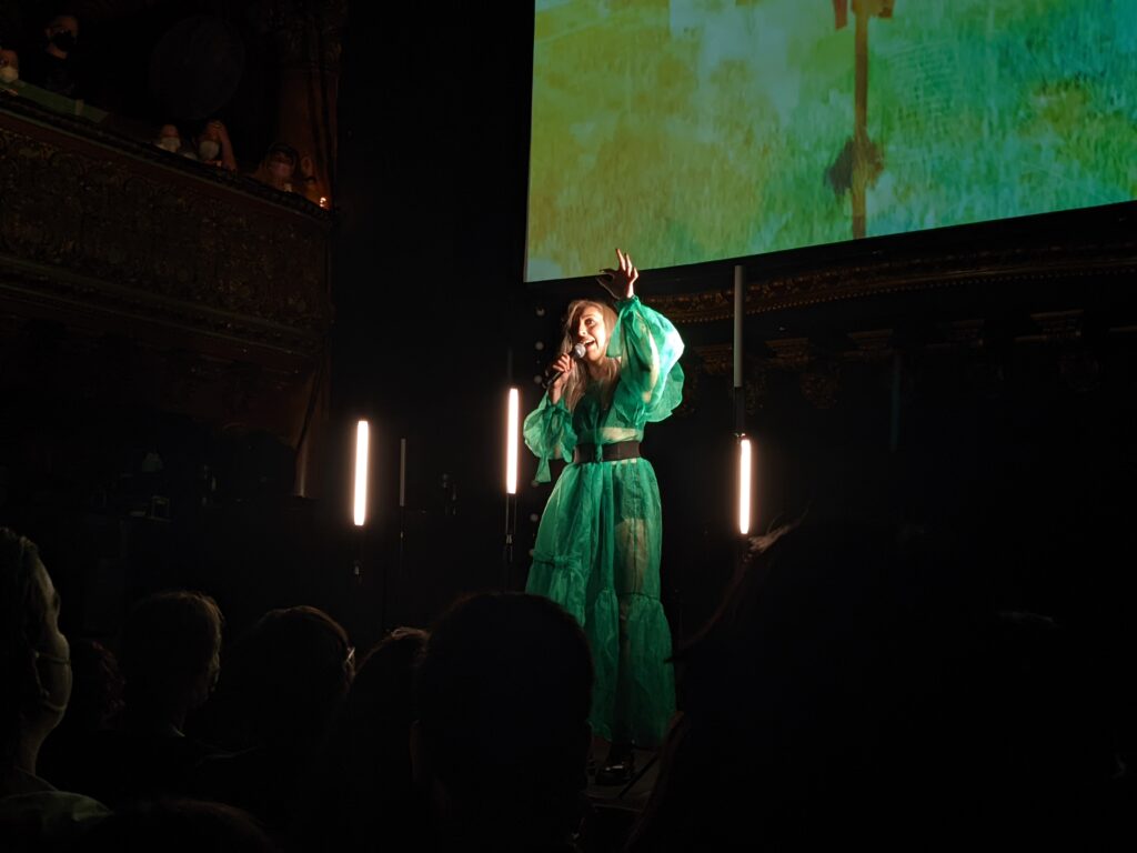 I attended her show not quite knowing what to expect, but with a feeling deep down that whatever was going to happen, it was going to be memorable. And I couldn’t have been more right. Taking the stage in a green couture dress made by frequent collaborator Ashley Rose, Kristin turned on half a dozen standing lights that mimicked candles before standing still as the sound of cicadas and rustling grass filled the otherwise silent hall. The audience stood silent, waiting. Finally she sang the line “Sinner, you better get ready,” the opening lines of the song “Many Hands,” over the instrumental backing track of plucked dulcimer, psaltery, and shruti box. From that moment until the end, Lingua Ignota had the audience hanging on every word that would proceed to come out of her mouth.